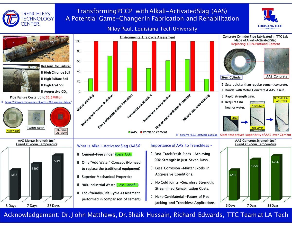 Coming up with a solution to this PCCP conundrum is Niloy Paul’s passion. He is a Ph.D. student in Micro and Nanoscale Systems Concentration at Louisiana Tech University, and a member of the NASTT Louisiana Tech University Student Chapter. He recently summed up his solution in a three-minute poster presentation titled “Transforming PCCP with Alkali-Activated Slag (AAS): A Potential Game-Changer in Fabrication and Rehabilitation.”