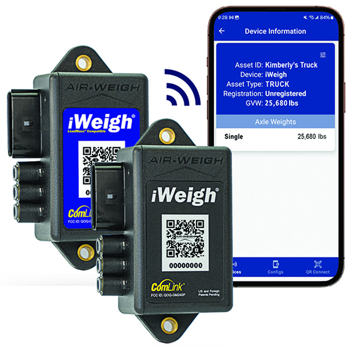 Measure weight accurately and prevent costly overweight fines with iWeigh from Air-Weigh On-Board Scales. It delivers real-time weight monitoring, network connectivity and over-the-air updates as a flexible solution for any fleet. It works with both air and mechanical suspensions, offering over 99% accuracy for air suspensions and over 97% accuracy for mechanical suspensions. It offers dual-point calibration, over-the-air updates, seamless connection with other iWeigh devices, an extended Bluetooth range of up to 100 feet, a mobile app for most Android devices and support of CANbus/SAE J1939 communications. The LoadMaxx Compatible option features backwards compatibility with all LoadMaxx and LoadMaxx Plus scales! 888-459-3444; www.air-weigh.com